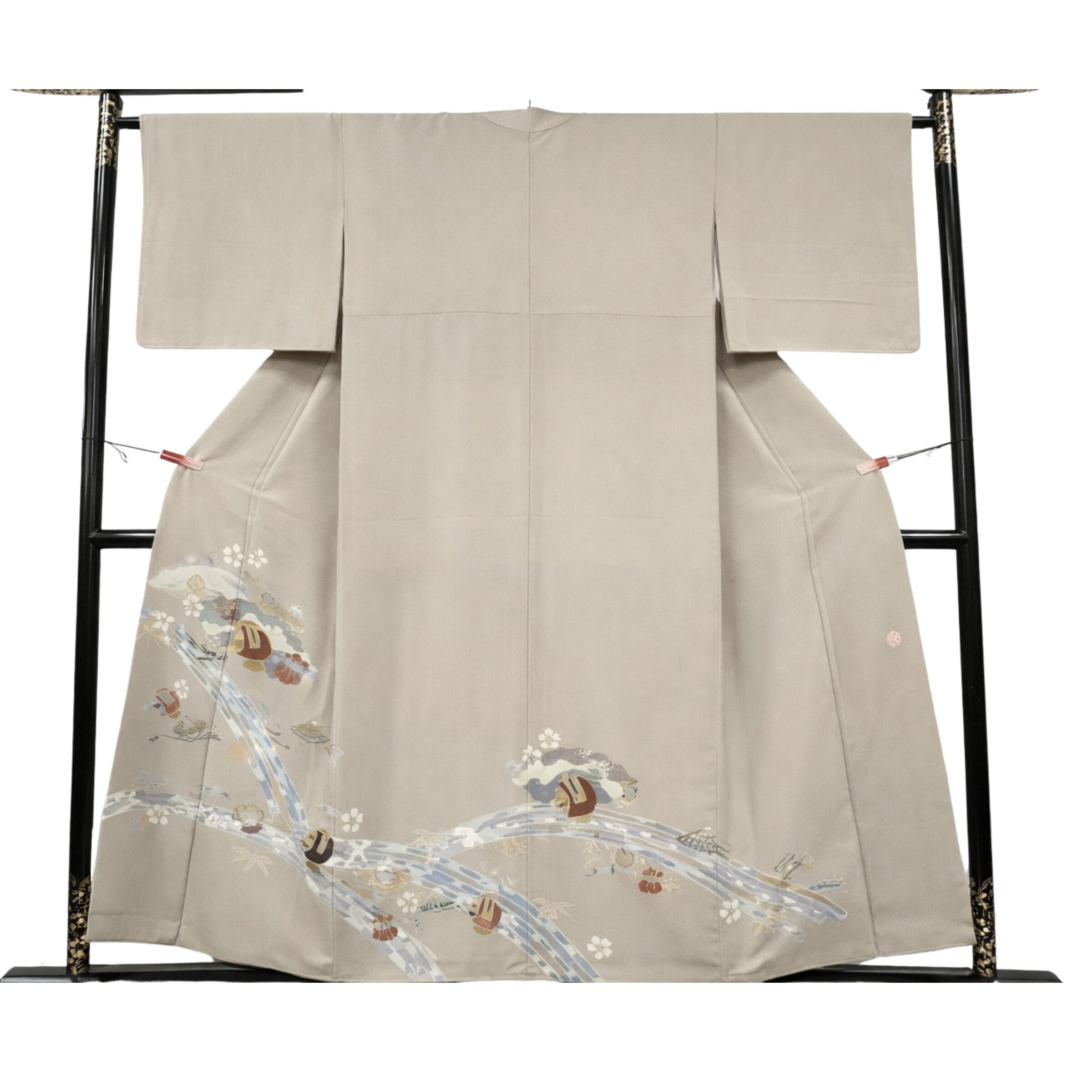 今回お買取りさせていただいた絵羽模様の訪問着は、上品なベージュ地に流れるような柄配置が特徴で、落ち着いた中にも華やかさのあるデザインが評価ポイントとなりました。裾にかけて描かれた流水と草花の意匠が美しく、全体として統一感のある仕上がりになっているお品でした。訪問着の中でもこのような控えめで上品な色味は幅広い年代に需要があり、再販しやすい点も評価につながりました。状態も良好であったため、5,000円でのお買取りとなりました。他社様では2,000円の査定とのことでしたが、当店では柄の価値と需要をしっかり評価し、より高い価格をご提示させていただきました。